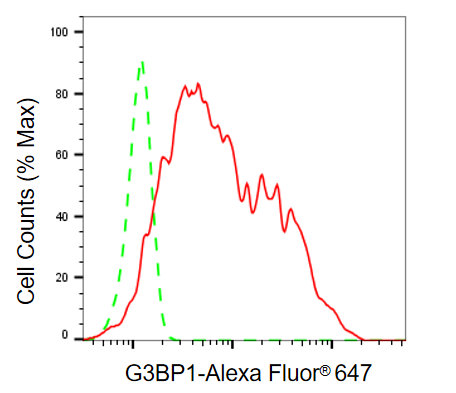 Flow cytometric analysis of G3BP1 expression in HepG2 cells using G3BP1 antibody. Green, isotype control; red, G3BP1.