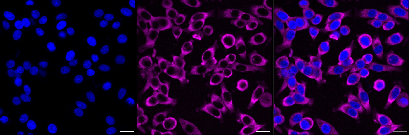 Immunocytochemical staining of HepG2 cells with G3BP1 antibody. Nuclei were stained blue with DAPI; G3BP1 was stained magenta with Alexa Fluor? 647. Images were taken using Leica stellaris 5. Protein abundance based on laser Intensity and smart gain: High. Scale bar, 20 μm.