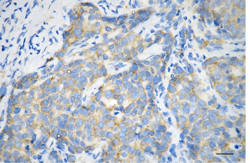 Immunohistochemistry was performed on paraffin-embedded human breast carcinoma using G3BP1 antibody. Antigen retrieval was done in sodium citrate buffer (pH 6.0). DAB was used for detection, with hematoxylin counterstaining. Images were acquired using a Nikon Ci-L Plus microscope (40× objective). Scale bar: 25 μm.