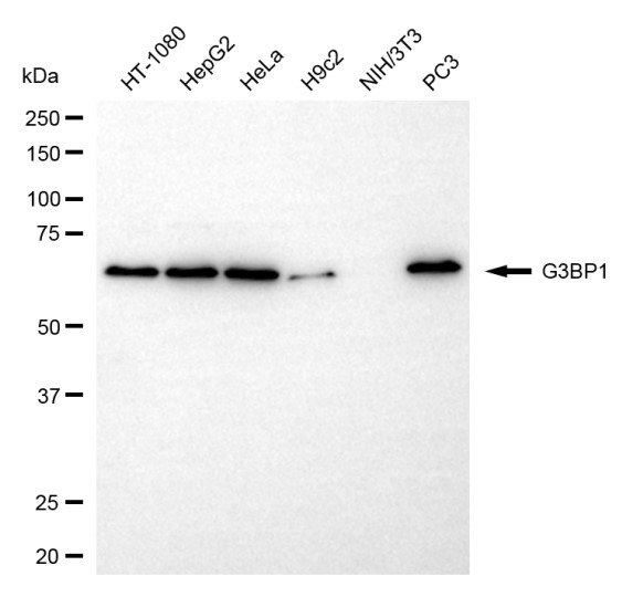 Western blotting analysis using G3BP1 antibody. Total cell lysates (30 μg) from various cell lines were loaded and separated by SDS-PAGE. The blot was incubated with G3BP1 antibody and HRP-conjugated goat anti-rabbit secondary antibody respectively.