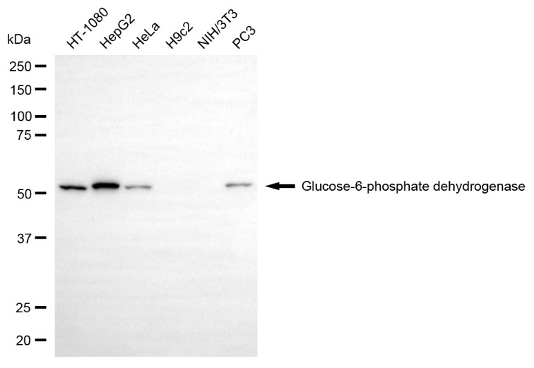 Western blotting analysis using glucose-6-phosphate dehydrogenase antibody. Total cell lysates (30 μg) from various cell lines were loaded and separated by SDS-PAGE. The blot was incubated with glucose-6-phosphate dehydrogenase antibody and HRP-conjugated goat anti-rabbit secondary antibody respectively.