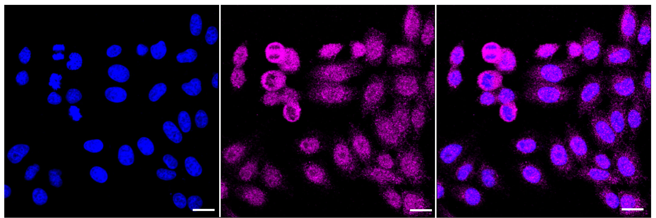 Immunocytochemical staining of HepG2 cells with GAPDH antibody. Nuclei were stained blue with DAPI; GAPDH was stained magenta with Alexa Fluor? 647. Images were taken using Leica stellaris 5. Protein abundance based on laser Intensity and smart gain: Medium. Scale bar: 20 μm.