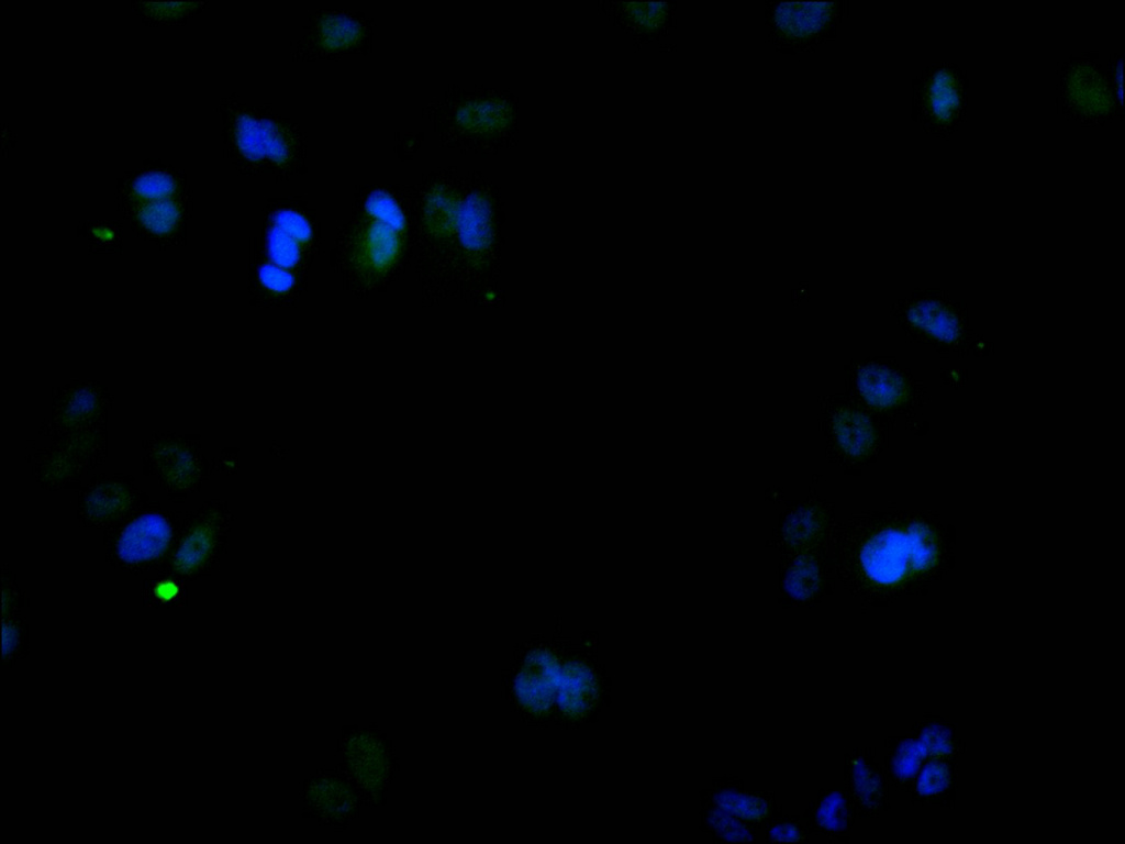 Immunofluorescence staining of MCF-7 cell with CSB-RA256477A0HU at 1:50, counter-stained with DAPI. The cells were fixed in 4% formaldehyde, permeabilized using 0.2% Triton X-100 and blocked in 10% normal Goat Serum. The cells were then incubated with the antibody overnight at 4°C. The secondary antibody was Alexa Fluor 488-congugated AffiniPure Goat Anti-Rabbit IgG(H+L).