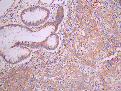 IHC image of CSB-RA440526A0HU diluted at 1:100 and staining in paraffin-embedded human gastric cancer performed on a Leica BondTM system. After dewaxing and hydration, antigen retrieval was mediated by high pressure in a citrate buffer (pH 6.0). Section was blocked with 10% normal goat serum 30min at RT. Then primary antibody (1% BSA) was incubated at 4°C overnight. The primary is detected by a Goat anti-rabbit polymer IgG labeled by HRP and visualized using 0.05% DAB.
