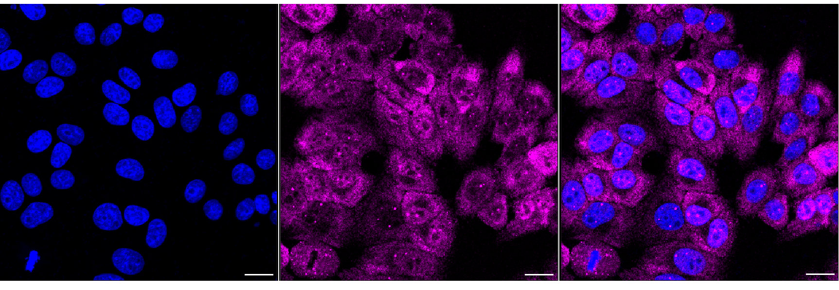 Immunocytochemical staining of HepG2 cells with GEMIN2 antibody. Nuclei were stained blue with DAPI; GEMIN2 was stained magenta with Alexa Fluor? 647. Images were taken using Leica stellaris 5. Protein abundance based on laser Intensity and smart gain: Medium. Scale bar, 20 μm.