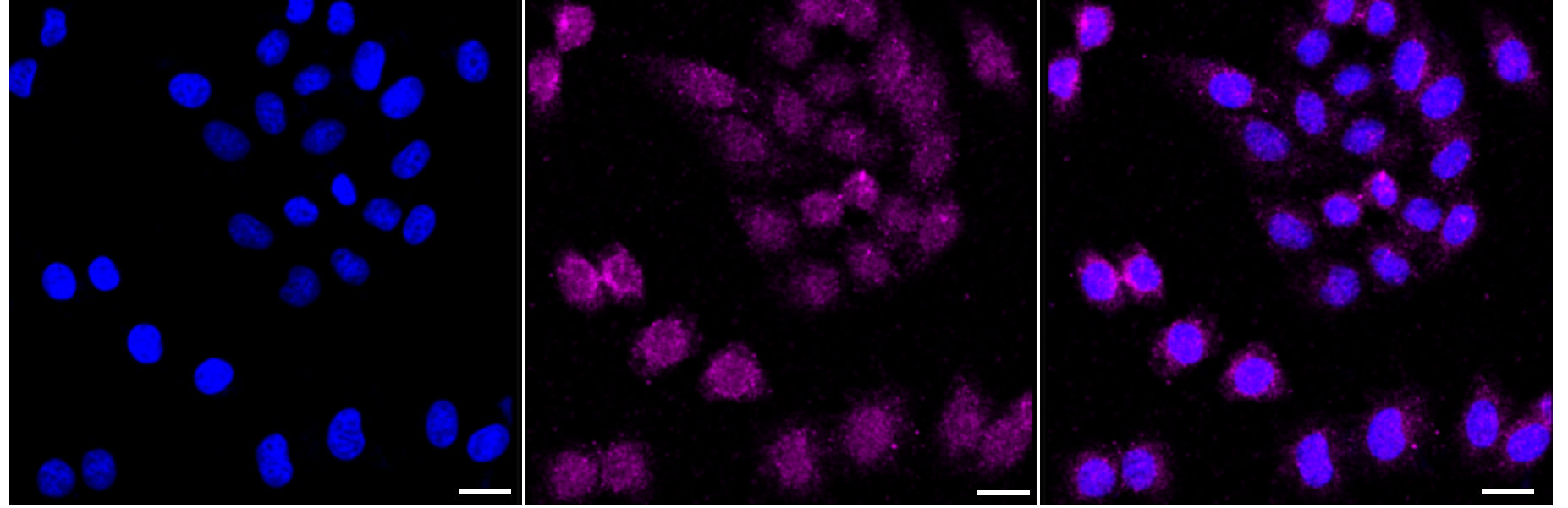 Immunocytochemical staining of HepG2 cells with GFPT1 antibody. Nuclei were stained blue with DAPI; GFPT1 was stained magenta with Alexa Fluor? 647. Images were taken using Leica stellaris 5. Protein abundance based on laser Intensity and smart gain: Low. Scale bar: 20 μm.