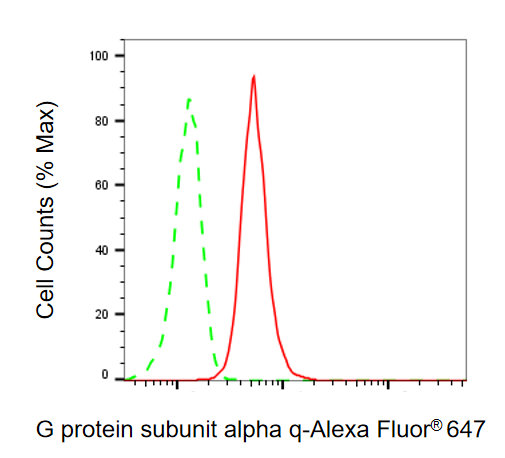 Flow cytometric analysis of G protein subunit alpha q expression in C2C12 cells using G protein subunit alpha q antibody. Green, isotype control; red, G protein subunit alpha q.