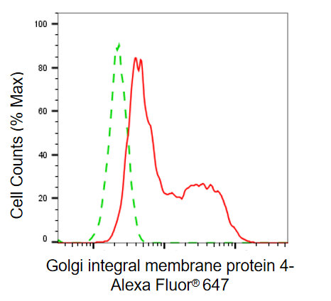 Flow cytometric analysis of golgi integral membrane protein 4 expression in HAP-1 cells using golgi integral membrane protein 4 antibody. Green, isotype control; red, golgi integral membrane protein 4.