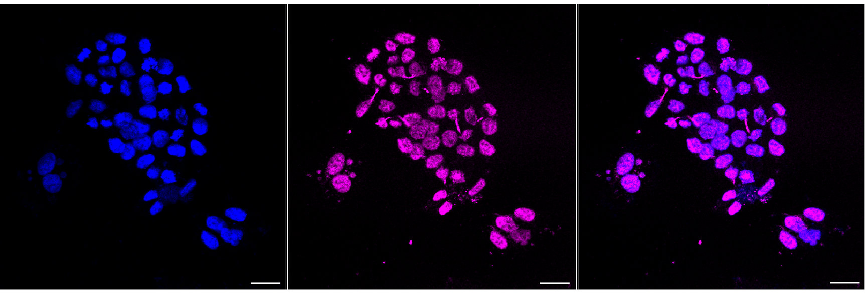 Immunocytochemical staining of HAP-1 cells with Histone H3 (acetyl K9)?antibody. Nuclei were stained blue with DAPI;Histone H3 (acetyl K9)?was stained magenta with Alexa Fluor? 647. Images were taken using Leica stellaris 5. Protein abundance based on laser Intensity and smart gain: High. Scale bar, 20 μm.