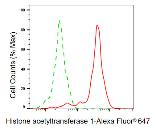 Flow cytometric analysis of histone acetyltransferase 1 expression in HeLa cells using histone acetyltransferase 1 antibody. Green, isotype control; red, histone acetyltransferase 1.
