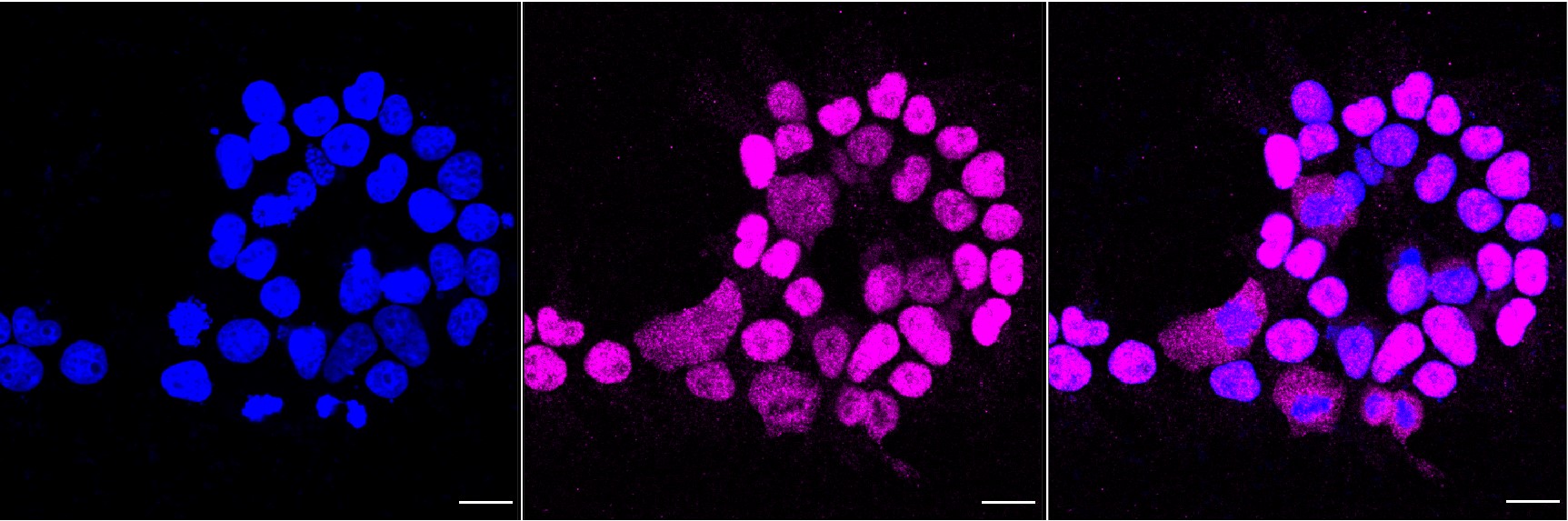 Immunocytochemical staining of Hela cells with Histone acetyltransferase 1 antibody. Nuclei were stained blue with DAPI; Histone acetyltransferase 1 was stained magenta with Alexa Fluor? 647. Images were taken using Leica stellaris 5. Protein abundance based on laser Intensity and smart gain: Medium. Scale bar, 20 μm.
