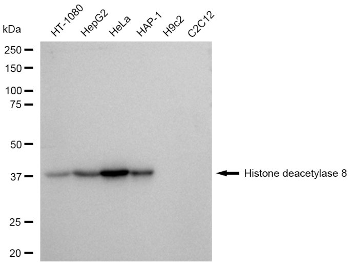 Western blotting analysis using Histone deacetylase 8 antibody. Total cell lysates (30 μg) from various cell lines were loaded and separated by SDS-PAGE. The blot was incubated with Histone deacetylase 8 antibody and HRP-conjugated goat anti-rabbit secondary antibody respectively.