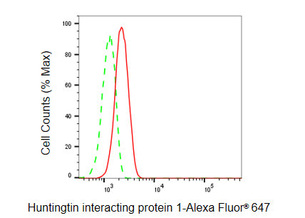 Flow cytometric analysis of Huntingtin interacting protein 1 expression in C2C12 cells using Huntingtin interacting protein 1 antibody. Green, isotype control; red, Huntingtin interacting protein 1.
