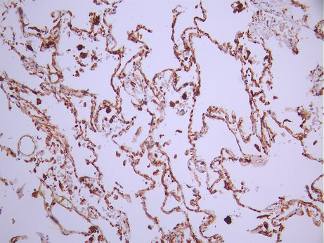 IHC image of CSB-RA260175A0HU diluted at 1:100 and staining in paraffin-embedded human lung tissue performed on a Leica BondTM system. After dewaxing and hydration, antigen retrieval was mediated by high pressure in a citrate buffer (pH 6.0). Section was blocked with 10% normal goat serum 30min at RT. Then primary antibody (1% BSA) was incubated at 4°C overnight. The primary is detected by a Goat anti-rabbit polymer IgG labeled by HRP and visualized using 0.05% DAB.