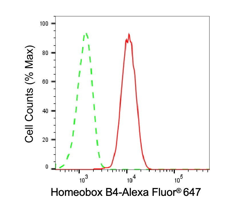 Flow cytometric analysis of Homeobox B4 expression in HAP-1 cells using Homeobox B4 antibody. Green, isotype control; red, Homeobox B4.
