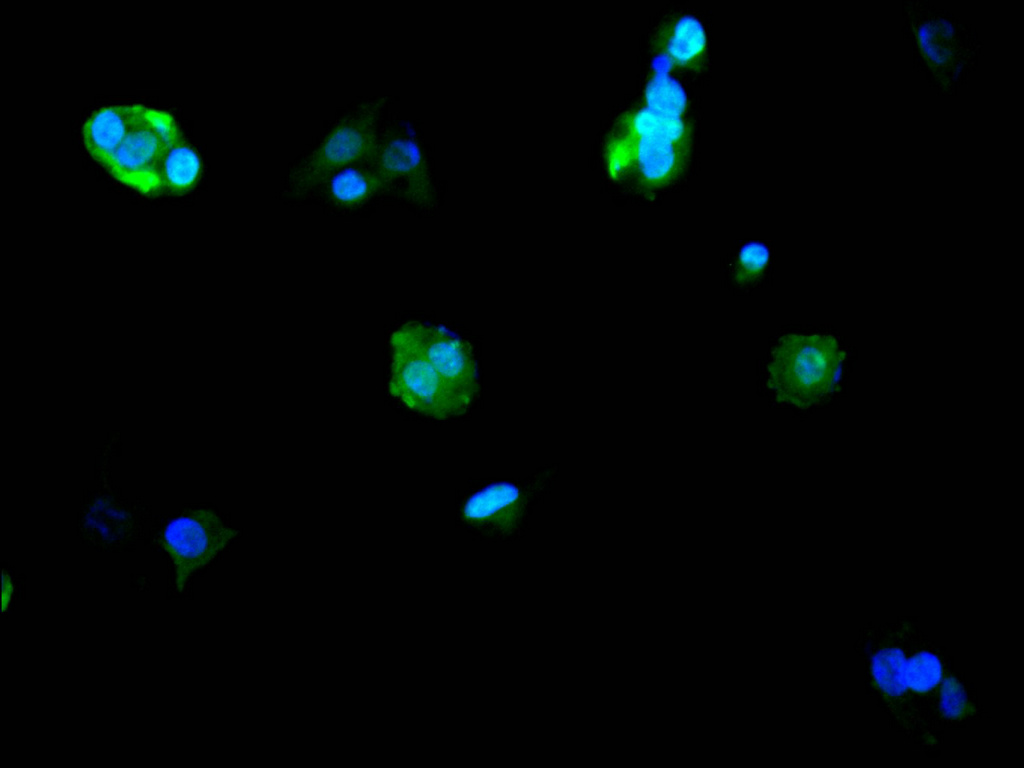 Immunofluorescence staining of A549 cell with CSB-RA357302MA1HU at 1:30 ,counter-stained with DAPI. The cells were fixed in 4% formaldehyde, permeabilized using 0.2% Triton X-100 and blocked in 10% normal Goat Serum. The cells were then incubated with the antibody overnight at 4°C. The secondary antibody was Alexa Fluor 488-congugated AffiniPure Goat Anti-Human IgG(H+L).