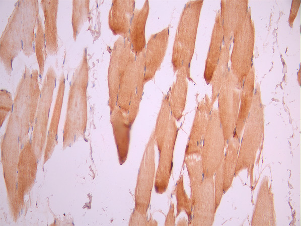 IHC image of CSB-RA062281A0HU diluted at 1:100 and staining in paraffin-embedded human skeletal muscle tissue performed on a Leica BondTM system. After dewaxing and hydration, antigen retrieval was mediated by high pressure in a citrate buffer (pH 6.0). Section was blocked with 10% normal goat serum 30min at RT. Then primary antibody (1% BSA) was incubated at 4°C overnight. The primary is detected by a Goat anti-rabbit polymer IgG labeled by HRP and visualized using 0.05% DAB.