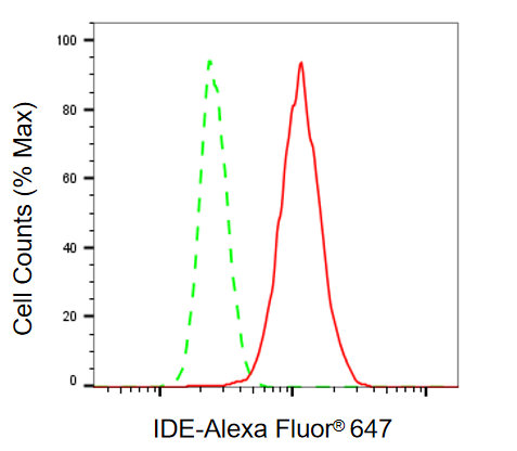 Flow cytometric analysis of IDE expression in HepG2 cells using IDE antibody. Green, isotype control; red, IDE.