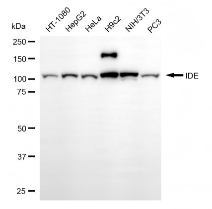 Western blotting analysis using IDE antibody. Total cell lysates (30 μg) from various cell lines were loaded and separated by SDS-PAGE. The blot was incubated with IDE antibody and HRP-conjugated goat anti-rabbit secondary antibody respectively.