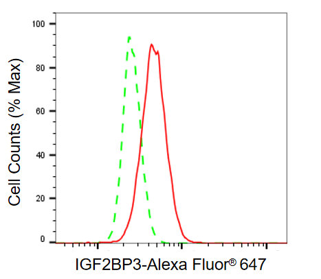 Flow cytometric analysis of IGF2BP3 expression in HepG2 cells using IGF2BP3 antibody. Green, isotype control; red, IGF2BP3.