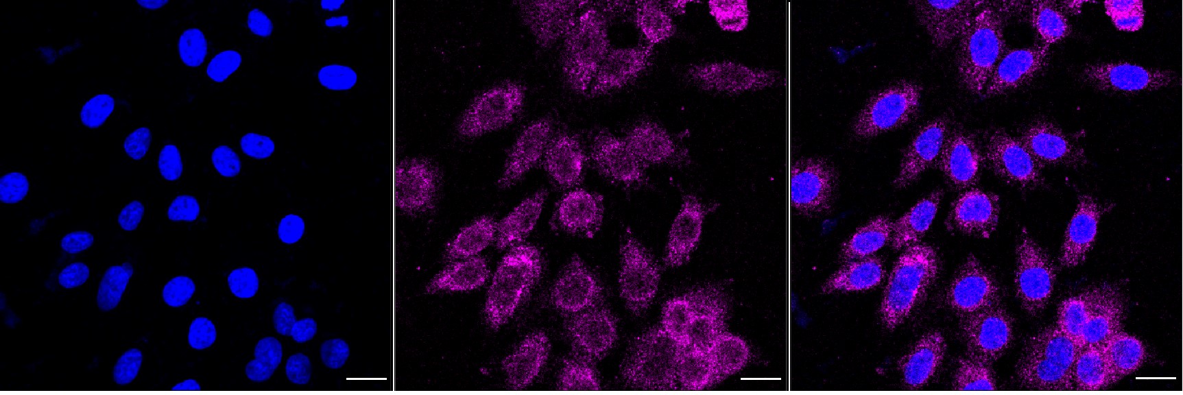 Immunocytochemical staining of HepG2 cells with IGF2BP3 antibody. Nuclei were stained blue with DAPI; IGF2BP3 was stained magenta with Alexa Fluor? 647. Images were taken using Leica stellaris 5. Protein abundance based on laser Intensity and smart gain: Medium. Scale bar, 20 μm.
