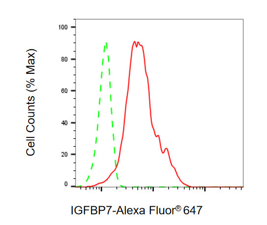 Flow cytometric analysis of IGFBP7 expression in HepG2 cells using IGFBP7 antibody. Green, isotype control; red, IGFBP7.