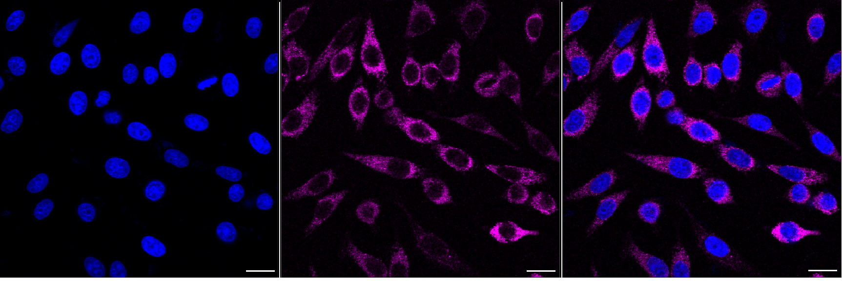 Immunocytochemical staining of HepG2 cells with IGFBP7 antibody. Nuclei were stained blue with DAPI; IGFBP7 was stained magenta with Alexa Fluor? 647. Images were taken using Leica stellaris 5. Protein abundance based on laser Intensity and smart gain: Medium. Scale bar, 20 μm.