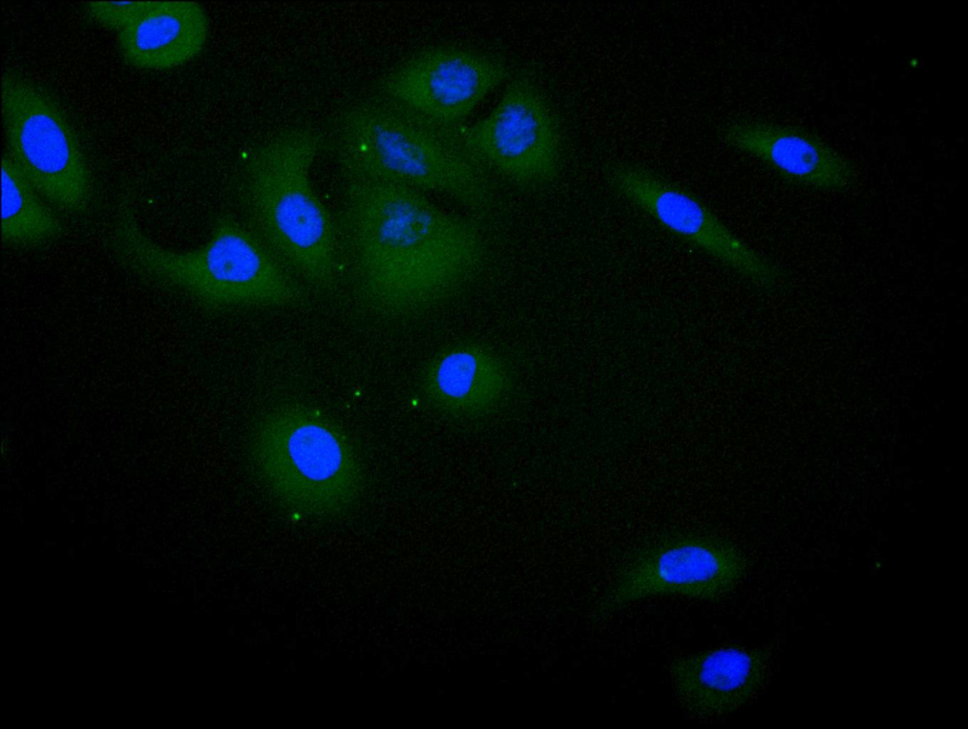 Immunofluorescence staining of A549 cell with CSB-RA011593MA1HU at 1:100, counter-stained with DAPI. The cells were fixed in 4% formaldehyde and blocked in 10% normal Goat Serum. The cells were then incubated with the antibody overnight at 4C. The secondary antibody was FITC-conjugated AffiniPure Goat Anti-Human IgG(H+L).