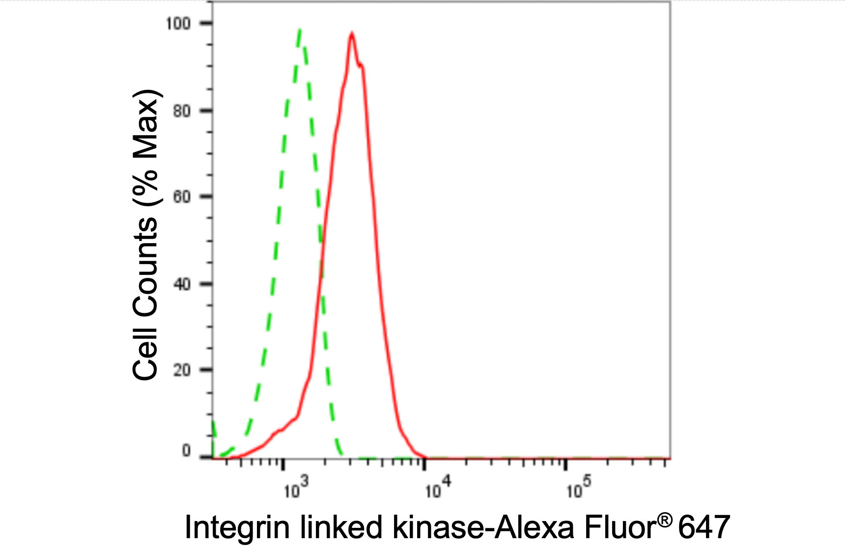 Flow cytometric analysis of Integrin linked kinase expression in C2C12 cells using Integrin linked kinase antibody. Green, isotype control; red, Integrin linked kinase.