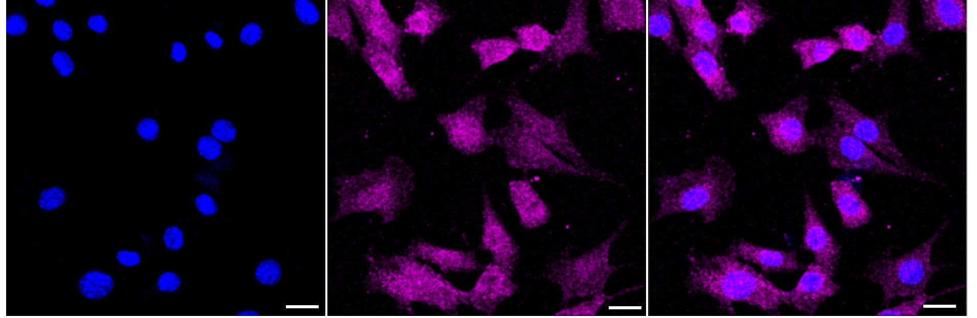 Immunocytochemical staining of C2C12 cells with Integrin linked kinase antibody. Nuclei were stained blue with DAPI; Integrin linked kinase was stained magenta with Alexa Fluor? 647. Images were taken using leica stellaris 5. Protein abundance based on laser intensity and smart gain: Medium. Scale bar: 20 μm.