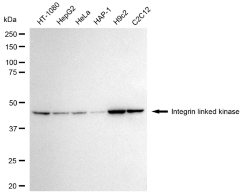 Western blotting analysis using Integrin linked kinase antibody. Total cell lysates (30 μg) from various cell lines were loaded and separated by SDS-PAGE. The blot was incubated with Integrin linked kinase antibody and HRP-conjugated goat anti-rabbit secondary antibody respectively.
