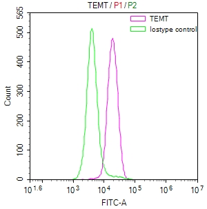 Overlay Peak curve showing SH-SY5Y cells stained with CSB-RA583078A0HU (red line) at 1:50. The cells were fixed in 4% formaldehyde and permeated by 0.2% TritonX-100. Then 10% normal goat serum to block non-specific protein-protein interactions followed by the antibody (1μg/1*106cells) for 45min at 4℃. The secondary antibody used was FITC-conjugated Goat Anti-rabbit IgG(H+L) at 1:200 dilution for 35min at 4℃.Control antibody (green line) was rabbit IgG (1μg/1*106cells) used under the same conditions. Acquisition of >10,000 events was performed.