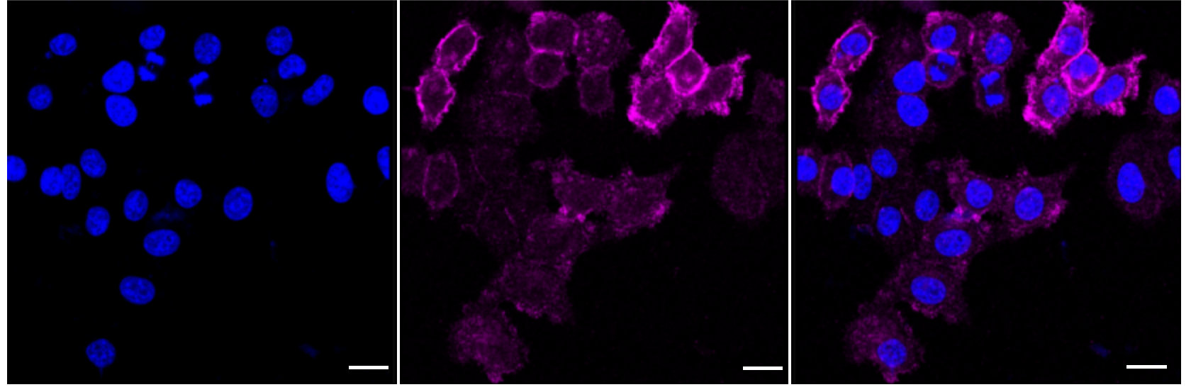 Immunocytochemical staining of HepG2 cells with Integrin subunit alpha 2 antibody. Nuclei were stained blue with DAPI; Integrin subunit alpha 2 was stained magenta with Alexa Fluor? 647. Images were taken using Leica stellaris 5. Protein abundance based on laser Intensity and smart gain: Medium. Scale bar: 20 μm.