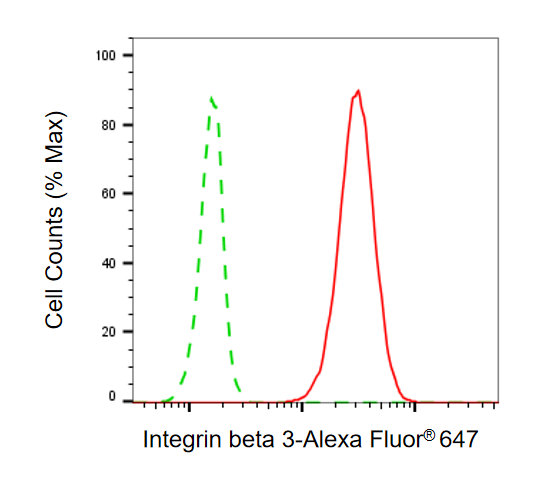 Flow cytometric analysis of Integrin beta 3 expression in C2C12 cells using Integrin beta 3 antibody. Green, isotype control; red, Integrin beta 3.