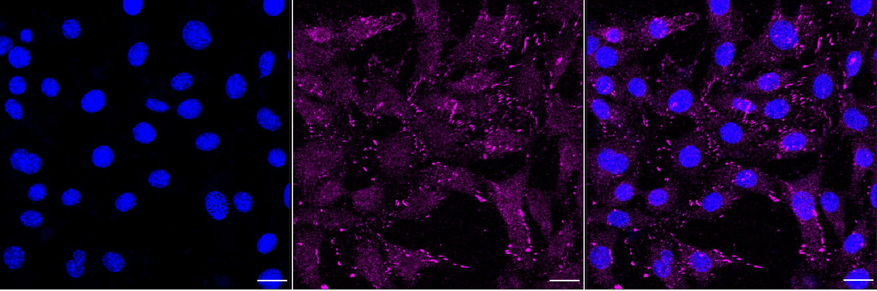 Immunocytochemical staining of C2C12 cells with Integrin beta 3 antibody. Nuclei were stained blue with DAPI; Integrin beta 3 was stained magenta with Alexa Fluor? 647. Images were taken using Leica stellaris 5. Protein abundance based on laser Intensity and smart gain: Medium. Scale bar, 20 μm.