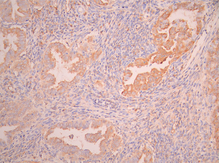 IHC image of CSB-RA011892MA1HU diluted at 1:50 and staining in paraffin-embedded human endometrial cancer performed on a Leica BondTM system. After dewaxing and hydration, antigen retrieval was mediated by high pressure in a citrate buffer (pH 6.0). Section was blocked with 10% normal goat serum 30min at RT. Then primary antibody (1% BSA) was incubated at 4°C overnight. The primary is detected by a Anti-Human lgG, Fcy Fragment Specific labeled by HRP and visualized using 0.05% DAB.