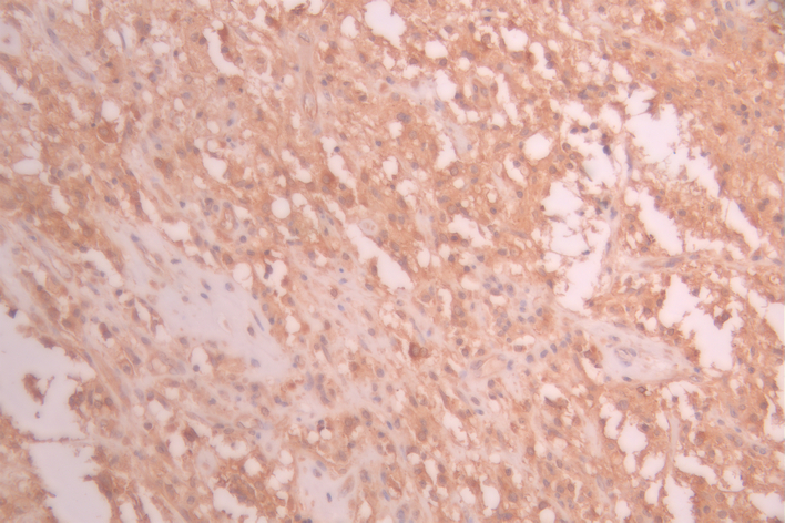 IHC image of CSB-RA189175A0HU diluted at 1:100 and staining in paraffin-embedded human glioma cancer performed on a Leica BondTM system. After dewaxing and hydration, antigen retrieval was mediated by high pressure in a citrate buffer (pH 6.0). Section was blocked with 10% normal goat serum 30min at RT. Then primary antibody (1% BSA) was incubated at 4°C overnight. The primary is detected by a Goat anti-rabbit polymer IgG labeled by HRP and visualized using 0.05% DAB.