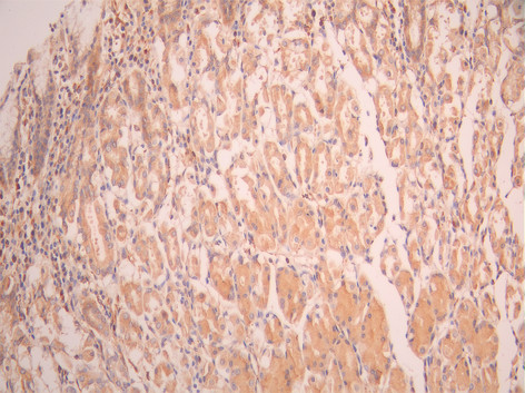 IHC image of CSB-RA213501A0HU diluted at 1:100 and staining in paraffin-embedded human stomach tissue performed on a Leica BondTM system. After dewaxing and hydration, antigen retrieval was mediated by high pressure in a citrate buffer (pH 6.0). Section was blocked with 10% normal goat serum 30min at RT. Then primary antibody (1% BSA) was incubated at 4°C overnight. The primary is detected by a Goat anti-rabbit polymer IgG labeled by HRP and visualized using 0.05% DAB.