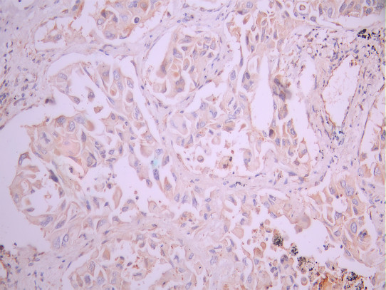 IHC image of CSB-RA213501A0HU diluted at 1:100 and staining in paraffin-embedded human lung cancer performed on a Leica BondTM system. After dewaxing and hydration, antigen retrieval was mediated by high pressure in a citrate buffer (pH 6.0). Section was blocked with 10% normal goat serum 30min at RT. Then primary antibody (1% BSA) was incubated at 4°C overnight. The primary is detected by a Goat anti-rabbit polymer IgG labeled by HRP and visualized using 0.05% DAB.