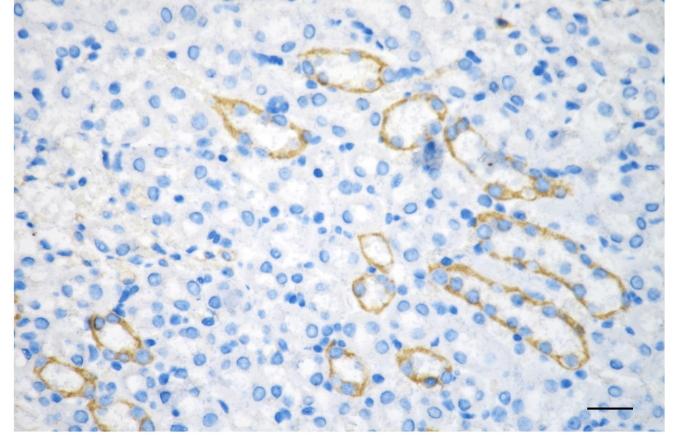 Immunohistochemistry was performed on paraffin-embedded mouse kidney using keratin 18 antibody. Antigen retrieval was done in sodium citrate buffer (pH 6.0). DAB was used for detection, with hematoxylin counterstaining. Images were acquired using a Nikon Ci-L Plus microscope (40× objective). Scale bar: 25 μm.