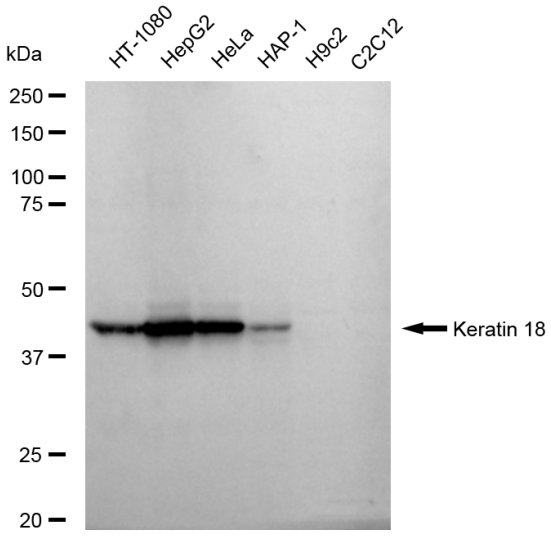 Western blotting analysis using Keratin 18 antibody. Total cell lysates (30 μg) from various cell lines were loaded and separated by SDS-PAGE. The blot was incubated with Keratin 18 antibody and HRP-conjugated goat anti-rabbit secondary antibody respectively.