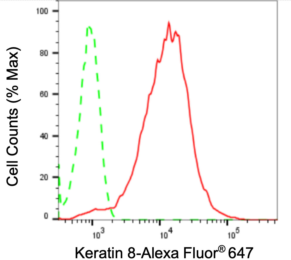 Flow cytometric analysis of Keratin 8 expression in HepG2 cells using Keratin 8 antibody. Green, isotype control; red, Keratin 8.