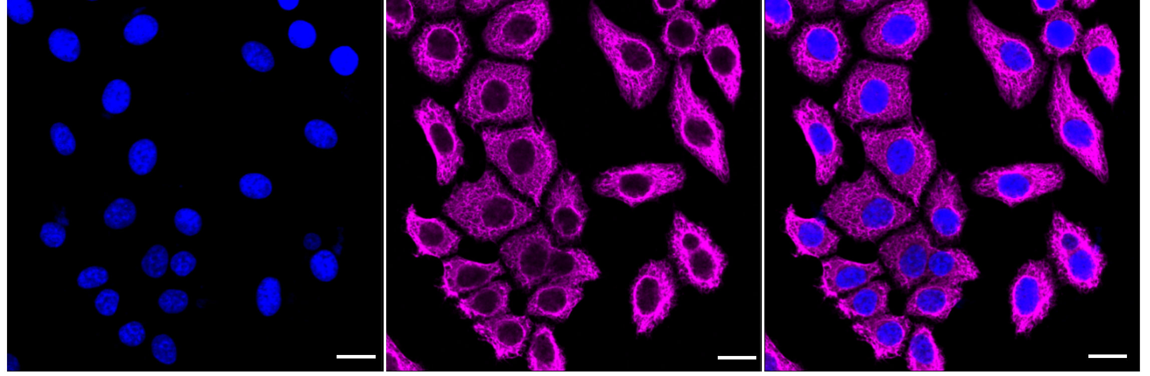Immunocytochemical staining of HepG2 cells with Keratin 8 antibody. Nuclei were stained blue with DAPI; Keratin 8 was stained magenta with Alexa Fluor? 647. Images were taken using Leica stellaris 5. Protein abundance based on laser Intensity and smart gain: High. Scale bar: 20 μm.