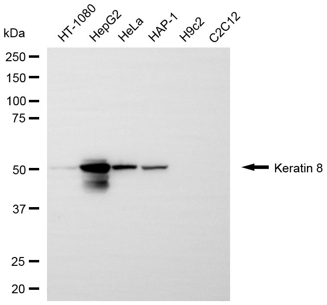 Western blotting analysis using Keratin 8 antibody. Total cell lysates (30 μg) from various cell lines were loaded and separated by SDS-PAGE. The blot was incubated with Keratin 8 antibody and HRP-conjugated goat anti-rabbit secondary antibody respectively.