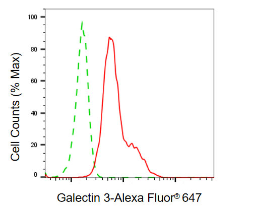Flow cytometric analysis of galectin 3 expression in HeLa cells using galectin 3 antibody. Green, isotype control; red, galectin 3.