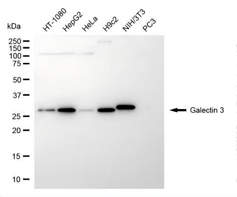 Western blotting analysis using galectin 3 antibody. Total cell lysates (30 μg) from various cell lines were loaded and separated by SDS-PAGE. The blot was incubated with galectin 3 antibody and HRP-conjugated goat anti-rabbit secondary antibody respectively.