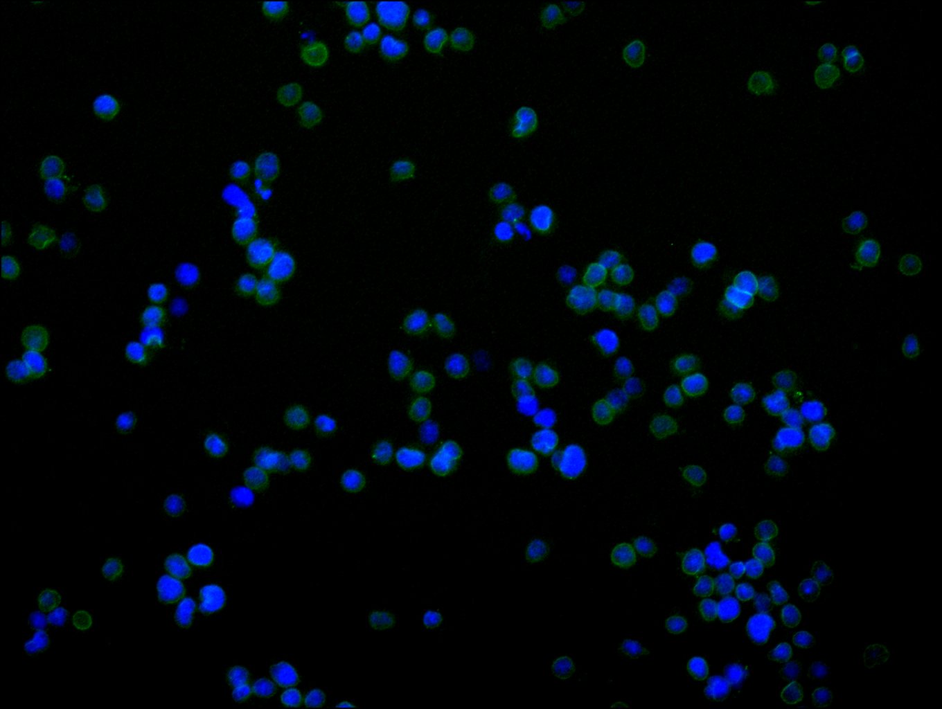 Immunofluorescence staining of Jurkat cell with CSB-RA266964A0HU at 1:50, counter-stained with DAPI. The cells were fixed in 4% formaldehyde, permeabilized using 0.2% Triton X-100 and blocked in 10% normal Goat Serum. The cells were then incubated with the antibody overnight at 4°C. The secondary antibody was Alexa Fluor 488-congugated AffiniPure Goat Anti-Rabbit IgG(H+L).