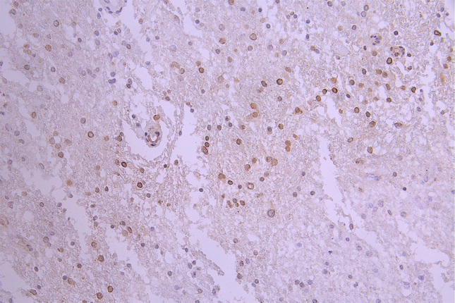 IHC image of CSB-RA266964A0HU diluted at 1:100 and staining in paraffin-embedded human glioma cancer performed on a Leica BondTM system. After dewaxing and hydration, antigen retrieval was mediated by high pressure in a citrate buffer (pH 6.0). Section was blocked with 10% normal goat serum 30min at RT. Then primary antibody (1% BSA) was incubated at 4°C overnight. The primary is detected by a Goat anti-rabbit polymer IgG labeled by HRP and visualized using 0.05% DAB.