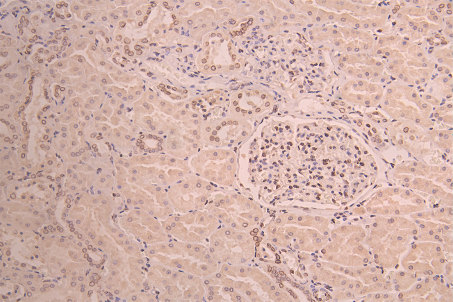 IHC image of CSB-RA266964A0HU diluted at 1:100 and staining in paraffin-embedded human kidney tissue performed on a Leica BondTM system. After dewaxing and hydration, antigen retrieval was mediated by high pressure in a citrate buffer (pH 6.0). Section was blocked with 10% normal goat serum 30min at RT. Then primary antibody (1% BSA) was incubated at 4°C overnight. The primary is detected by a Goat anti-rabbit polymer IgG labeled by HRP and visualized using 0.05% DAB.