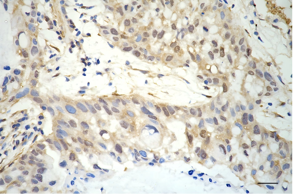 Immunohistochemistry was performed on paraffin-embedded human lung adenocarcinoma using LPP antibody. Antigen retrieval was done in sodium citrate buffer (pH 6.0). DAB was used for detection, with hematoxylin counterstaining. Images were acquired using a Nikon Ci-L Plus microscope (40× objective). Scale bar: 25 μm.